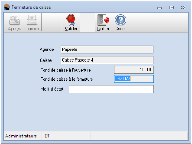 Attention : La fenêtre de fermeture de caisse n’est montrée ici que pour l’exemple. Ne pas valider la fermeture sans avoir effectué les dépenses.