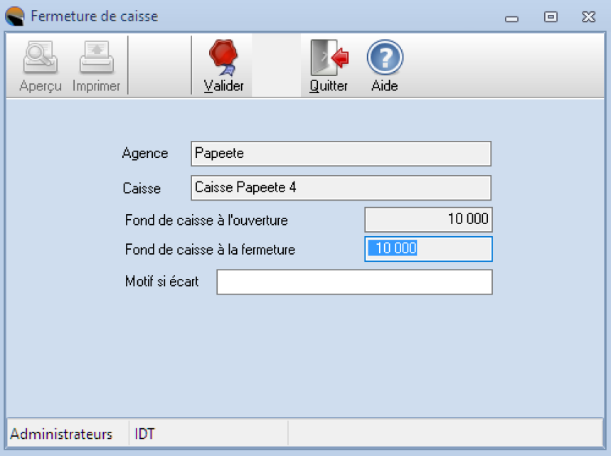 Si le fond de caisse à la fermeture est différent du fond de caisse à l’ouverture et qu’il n’y a pas eu d’erreur dans la saisie des dépenses, renseigner le champ Motif si écart.