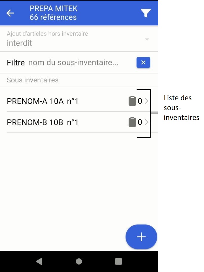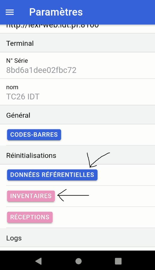 Attention : Le bouton Inventaire supprime les inventaires sur le terminal, et récupère les nouvelles données du serveur. Faite attention a bien envoyer vos données avant d'effectuer cette manipulation.