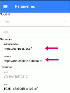 Une fois l'URL du serveur Numera saisie et valide, le champ Société->nom devient accessible (cf. image ci-dessous)