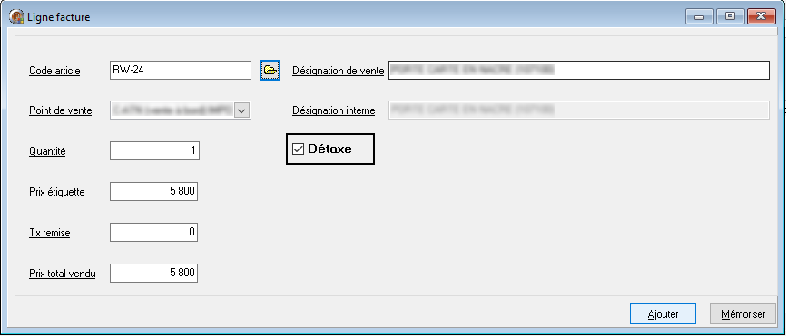 L'option de détaxe est activée par défaut. Si certains articles ne doivent pas être détaxés, il suffit de décocher cette option.