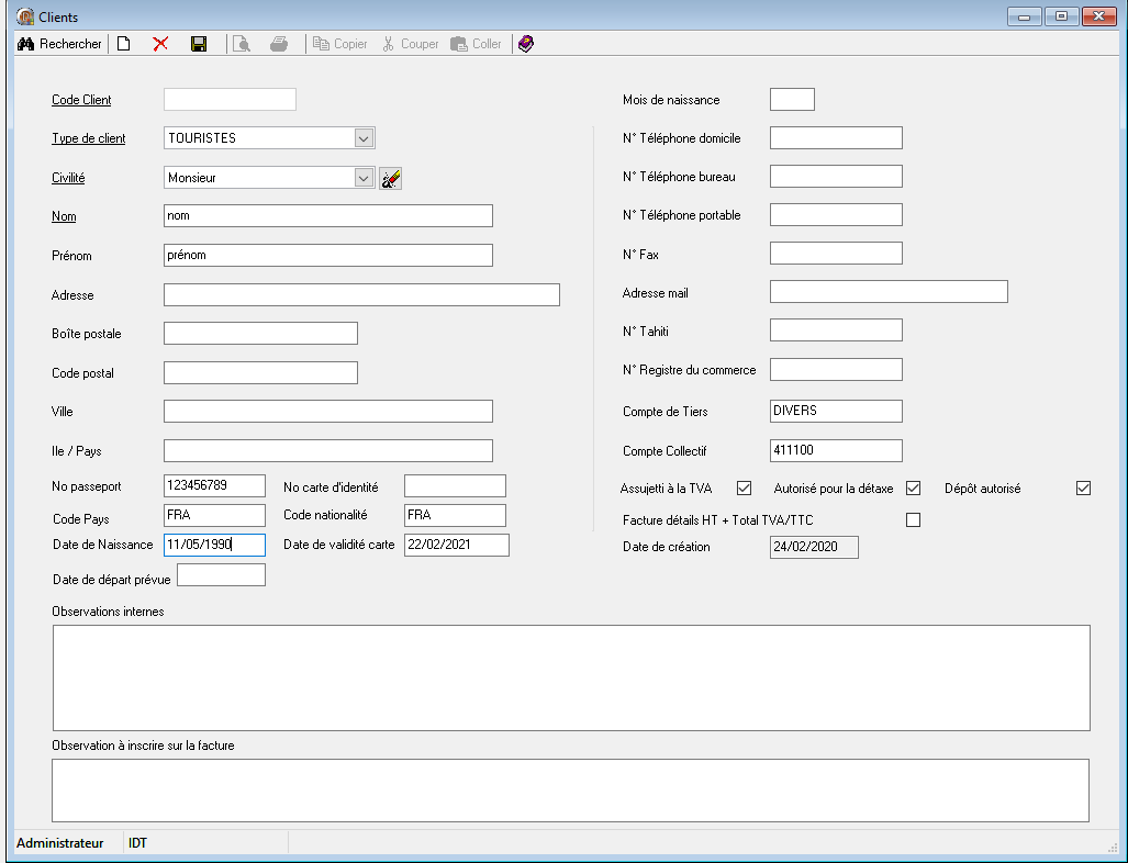 - Si le client existe déjà dans votre base mais que certains champs nécessaires à la détaxe sont manquants (N° de passeport, code nationalité ...), ...