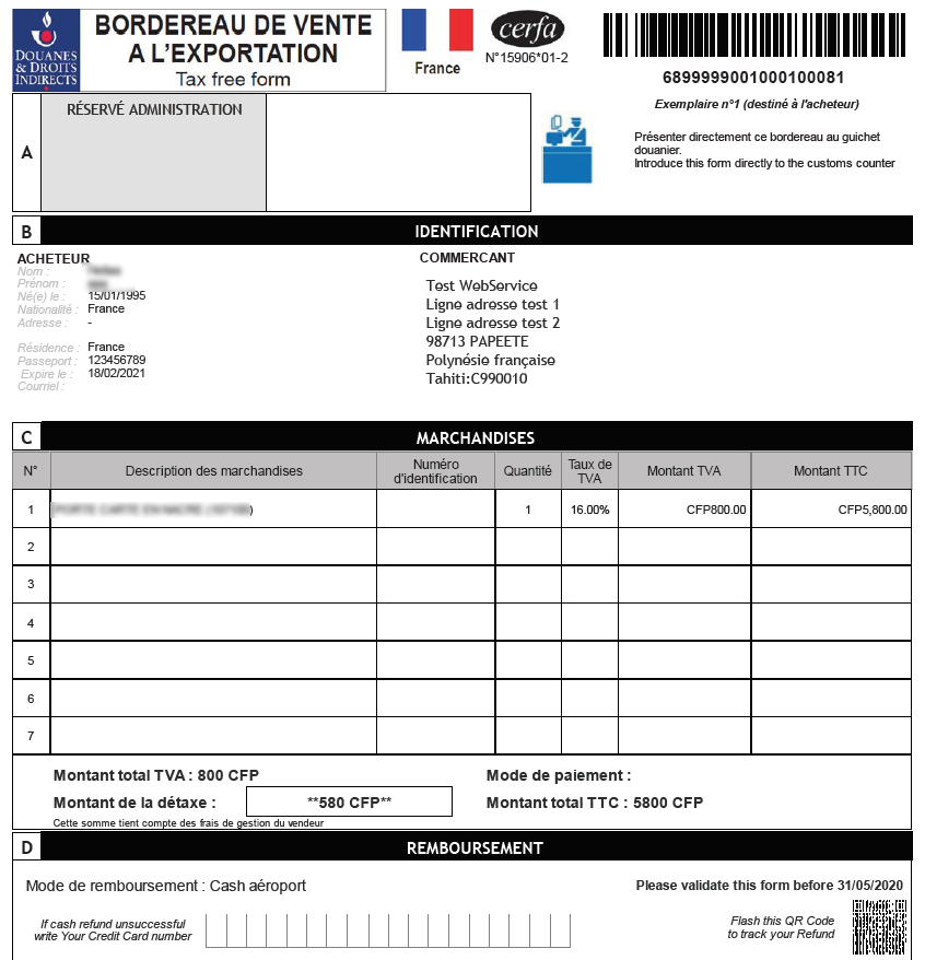 Les champs obligatoires à la détaxe sont les suivants :